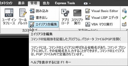 まずはリボンを使っている場合ですが、「管理」タブ内の「カスタマイズ」に「エイリアスを編集」という項目があるので、これをクリックです。