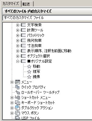 今度は「複写」コマンドと「鏡像」コマンドを検索して、同じ手順でコマンドを追加すると、こんな感じになります。