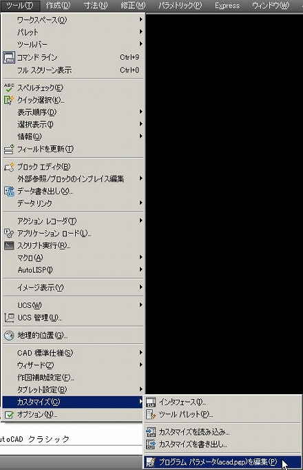 クラシック表示の場合には「ツール」メニュー内の「カスタマイズ」に「プログラムパラメータを編集」があるので、そこをクリック。