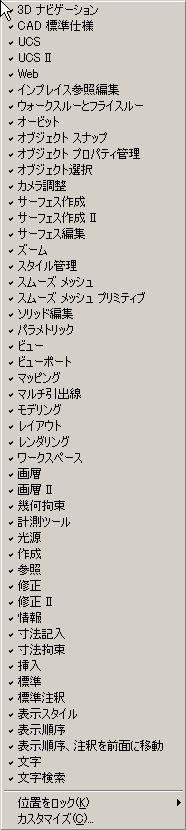 ちなみに、上記ツールバーの画像に全部チェックが入っているのは、オートキャド(AutoCAD)の画面上に全て表示されているから。